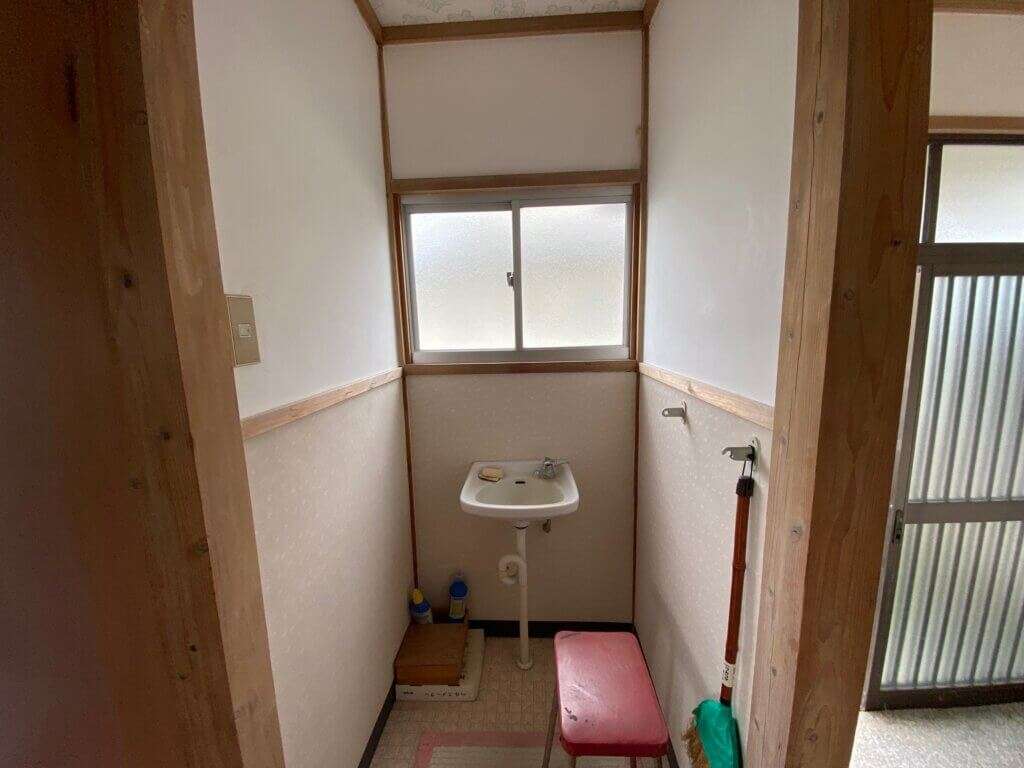 今回は、トイレが和式便器だけのタイプだったので、トイレと手洗い場の間の壁を壊し、ウォシュレットトイレを新設します。
